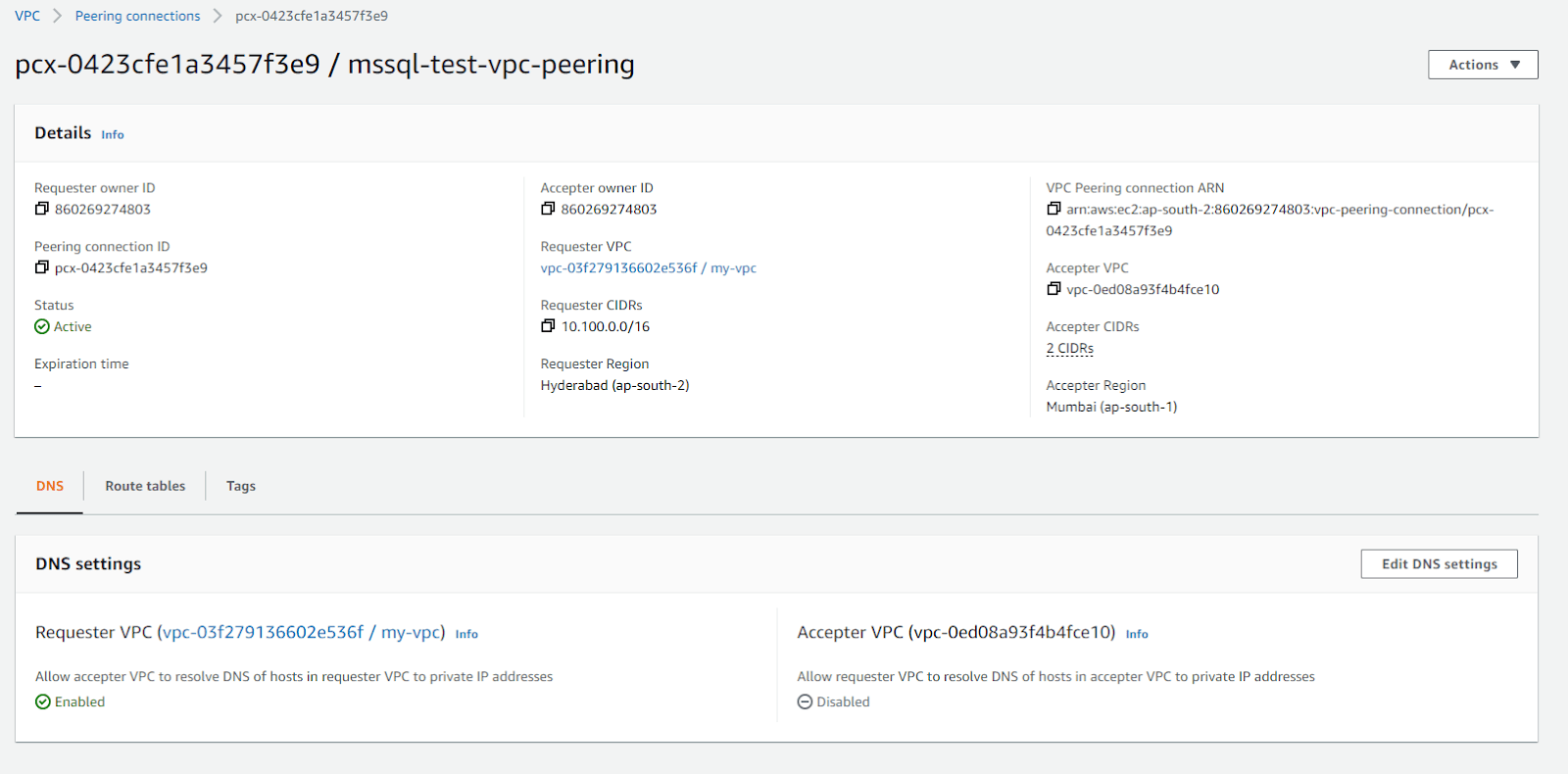 For this demo, I have selected VPC CIDR 10.100.0.0/16 in Hyderabad Region and 10.0.0.0/16 in Mumbai Region. I have launched the Instances in that specific VPC respectively, and in Public Subnet.