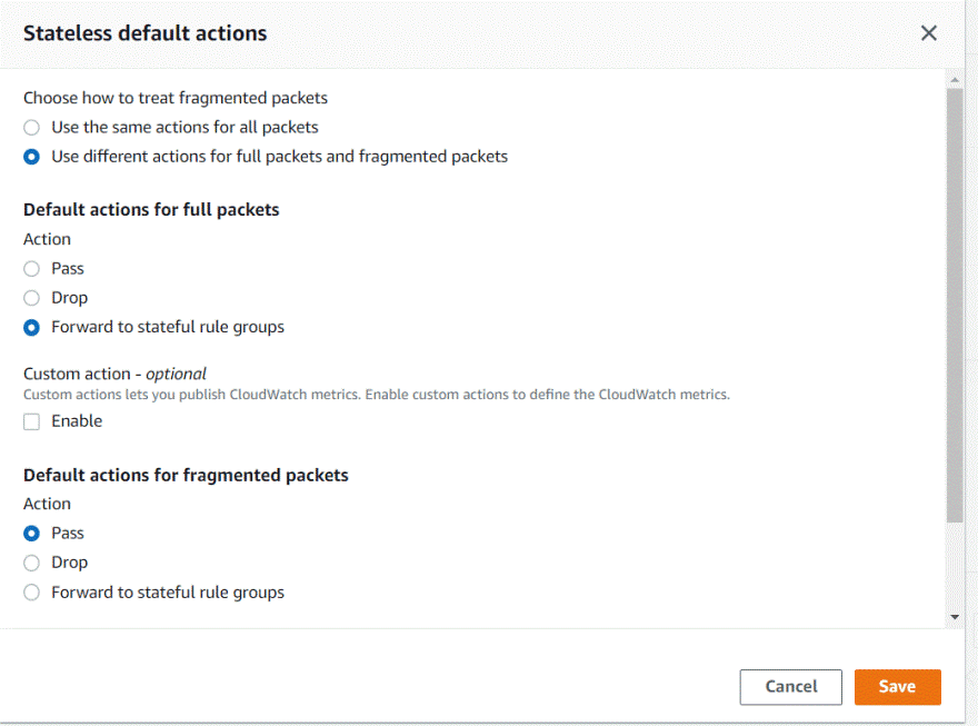 Forward to stateful rules – Discontinue stateless inspection of the packet and forward it to the stateful rule engine for inspection.