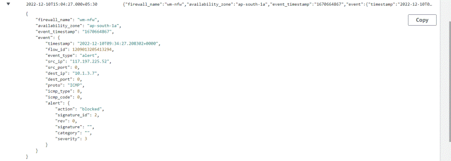 We can see in CloudWatch logs, traffic is blocked and captured in alert events.