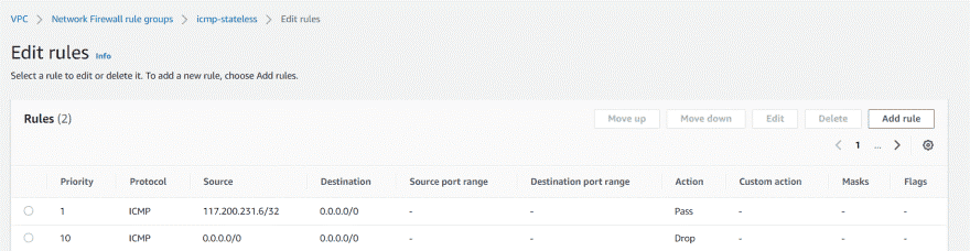 In the above rule group priority 1 rule having allow traffic from specific IP and deny all, however if we change the priority of 1 to 11 then , rule 10 will take precedence and all traffic will be dropped.