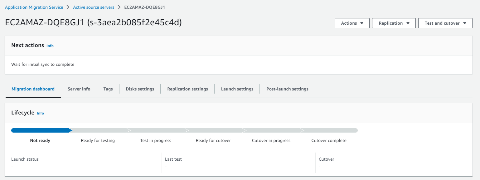 Once the AWS Replication Agent is installed, the server will be added to the Application Migration Service Console and will undergo the initial sync process. The installer will provide you with the source server’s ID.