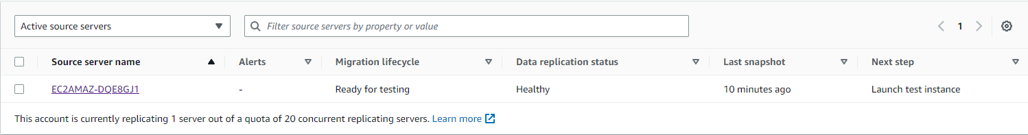 On the MGN console page, make sure that your source servers are ready for testing by looking at the following indicators. The source servers are Healthy and Ready for testing.