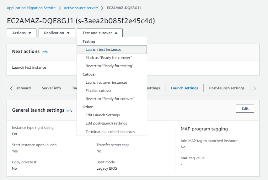 Prior to testing or cutting over an instance, configure the launch settings. The launch settings are a set of instructions that determine how a test or cutover instance is launched for each source server in AWS.