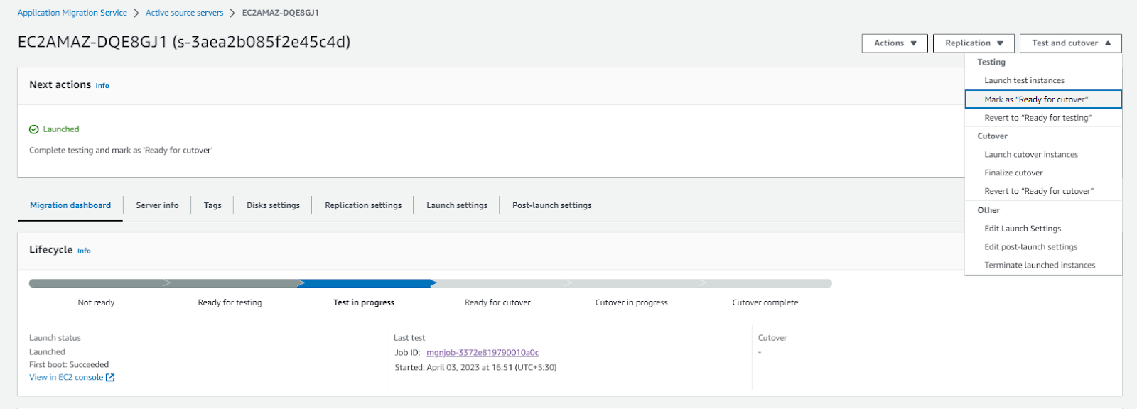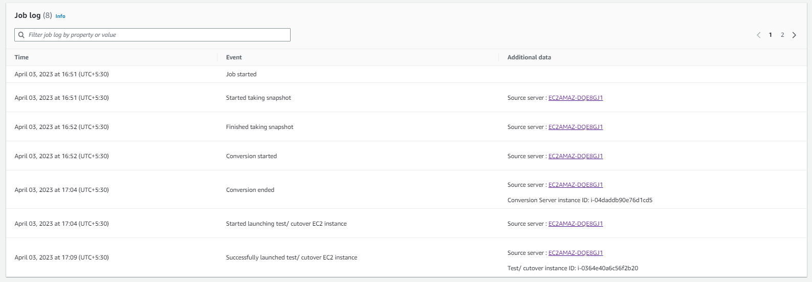 Make sure that the Migration lifecycle indicates that Test in progress, then select View job details in the top right corner to view the MGN job log details.