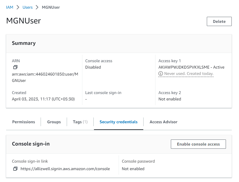 We have created MGNUser with AWSApplicationMigrationAgentPolicy and get Programmatic Access Keys.