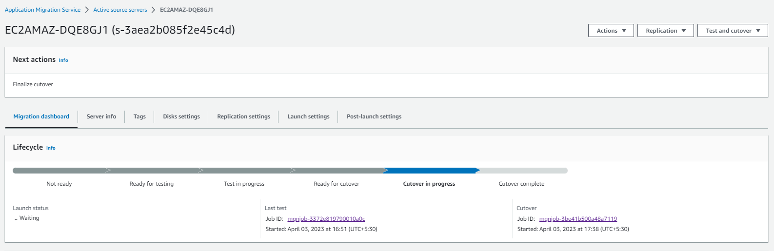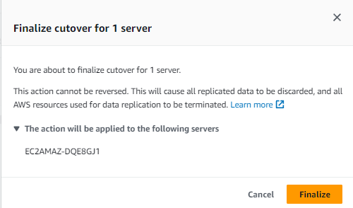 When the Finalize cutover dialog box appears, choose Finalize. This changes the source servers Migration Lifecycle status to Cutover complete.